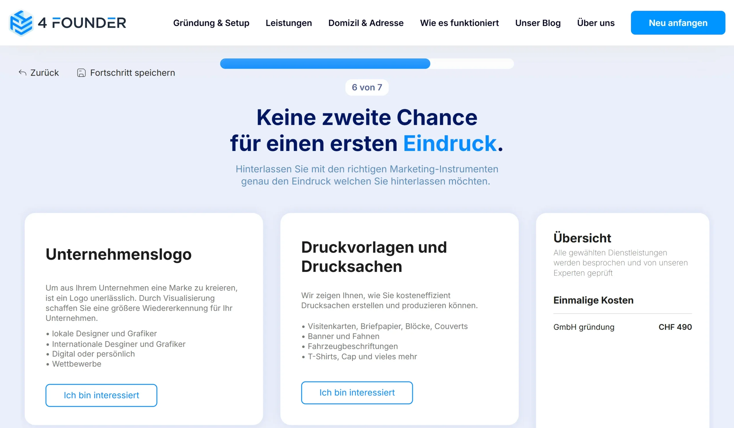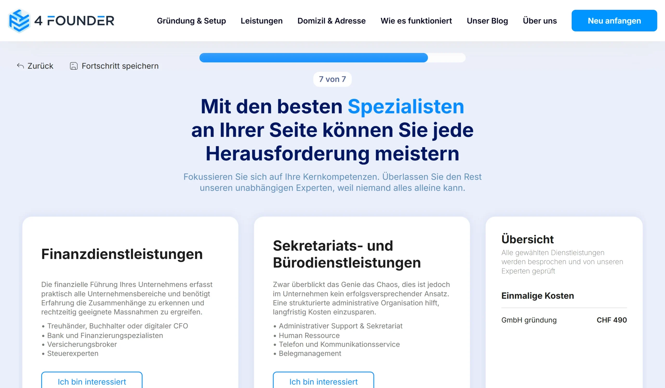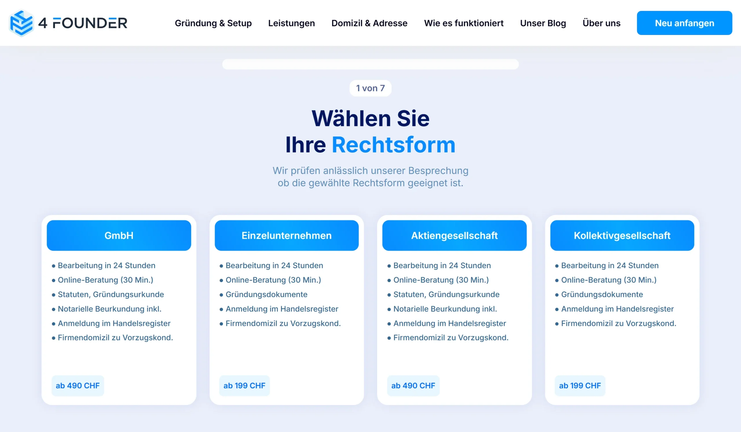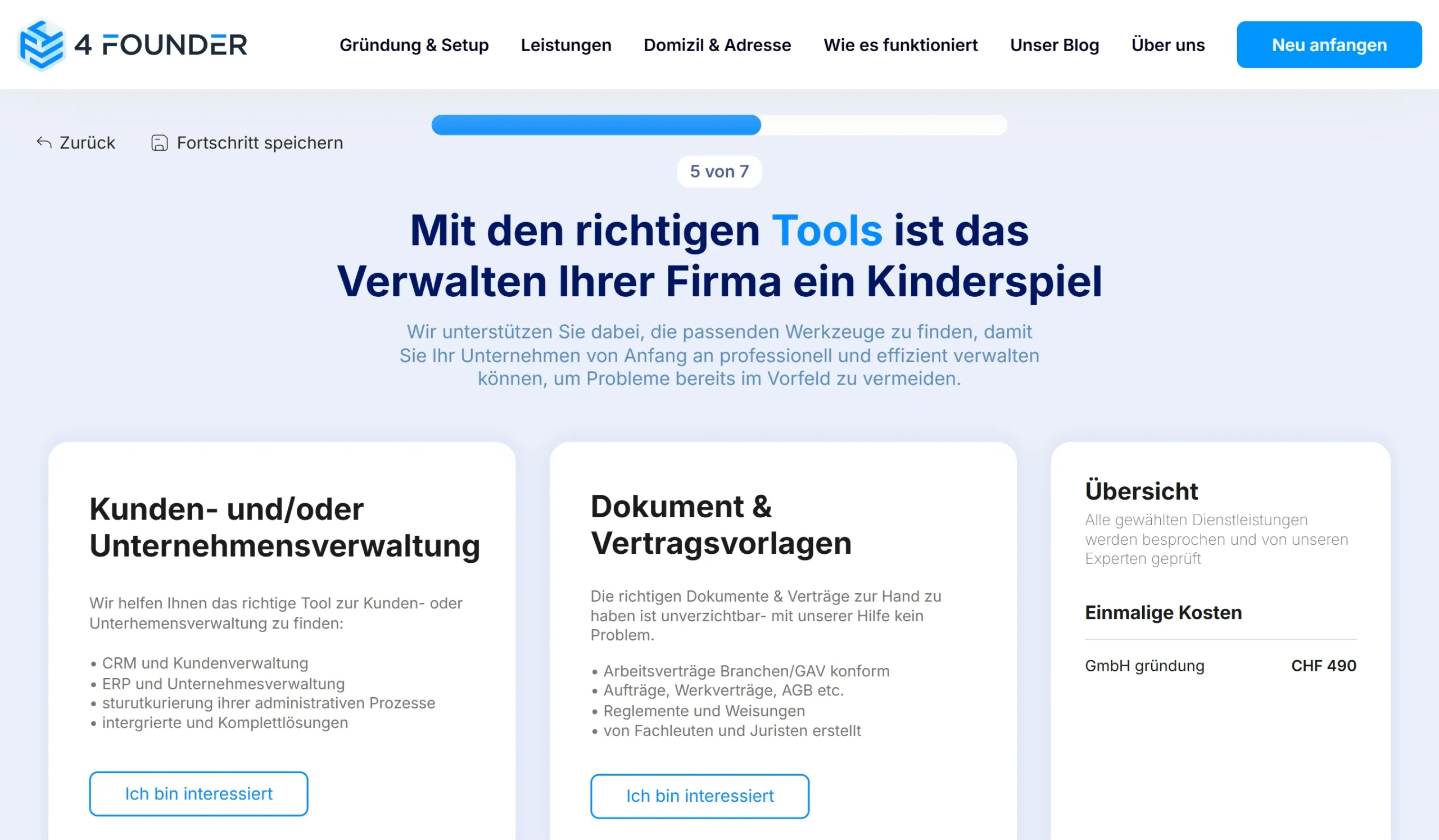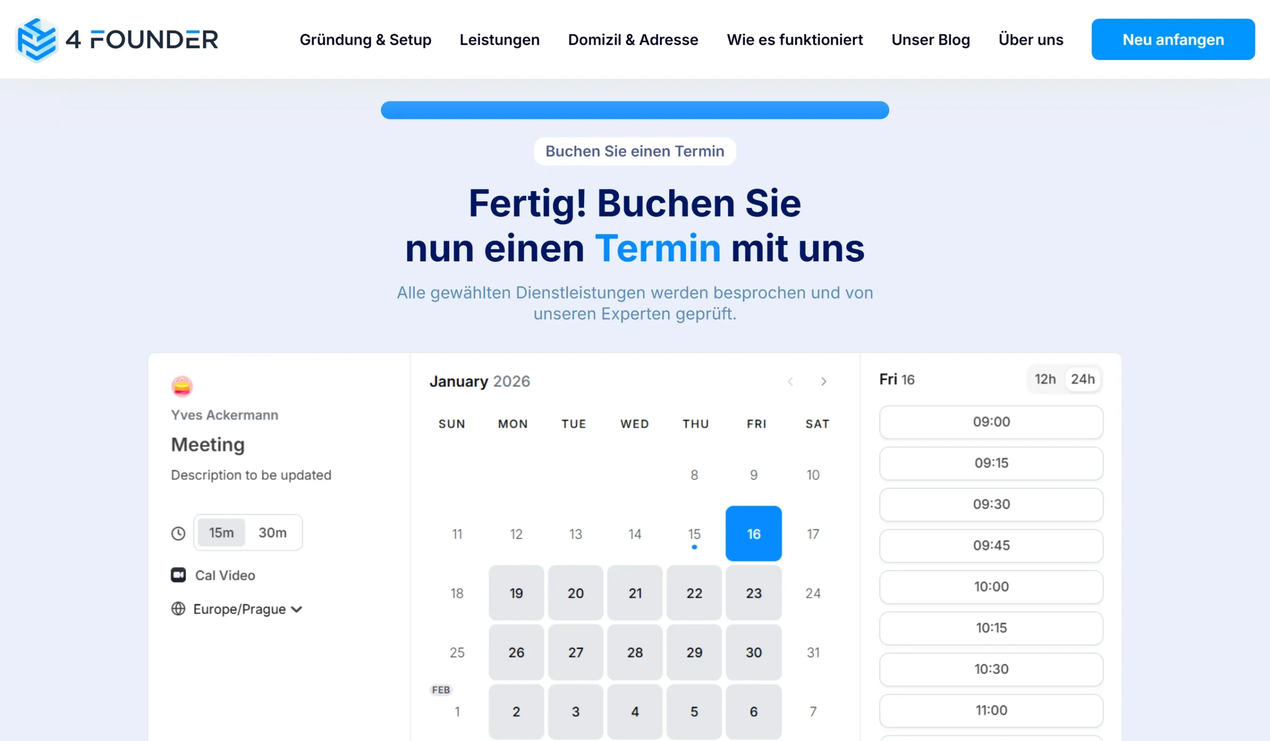 Sie konfigurieren Ihr Setup in wenigen Schritten. Wir besprechen die Auswahl in einem kurzen Online-Gespräch, klären offene Punkte und verschlanken, wo sinnvoll. Bis einschließlich Kurzgespräch ist alles kostenlos und unverbindlich. Erst danach entscheiden Sie, ob Sie mit uns gründen.