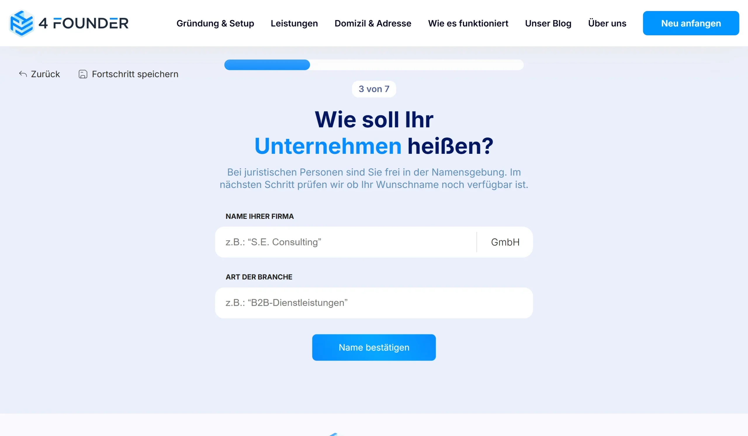 Prüfen Sie Ihren Wunschnamen via Live-Abgleich mit der Handelsregisterdatenbank (frei/belegt/ähnlich). Wählen Sie zusätzlich Ihre Branche – darauf basieren spätere Vorschläge für den offiziellen Zweck des Unternehmens.